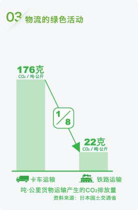 卡车运输转换为铁路运输,CO2排放量可减少到1/8。我们推广运输形态转换,以便减轻对环境的影响。